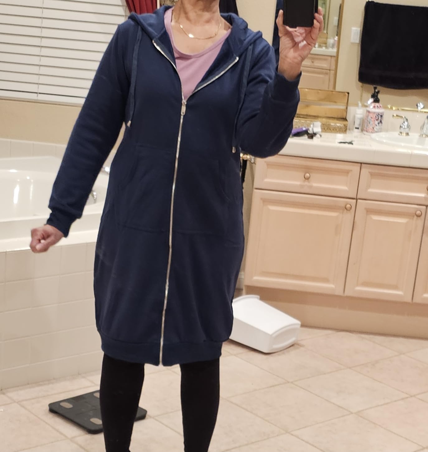 Featuring a full zip closure, drawstring hood, and roomy side pockets, this knee-length hoodie feels like a blanket you can wear anywhere — from lounging at home to running errands or traveling.