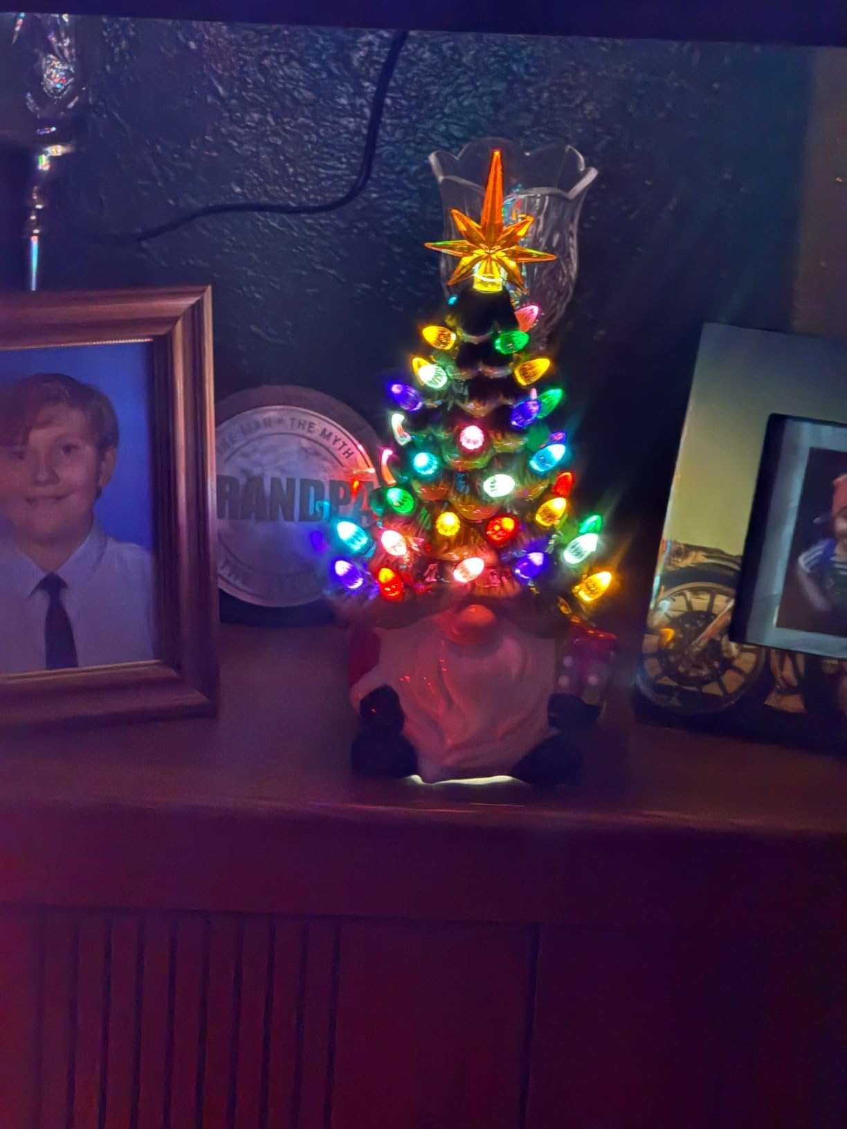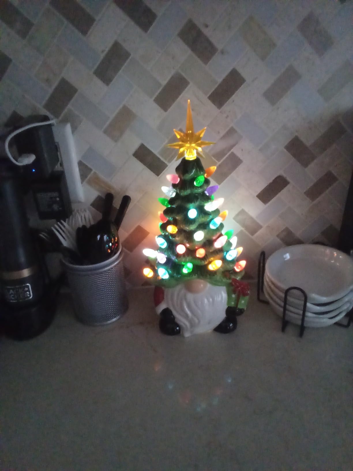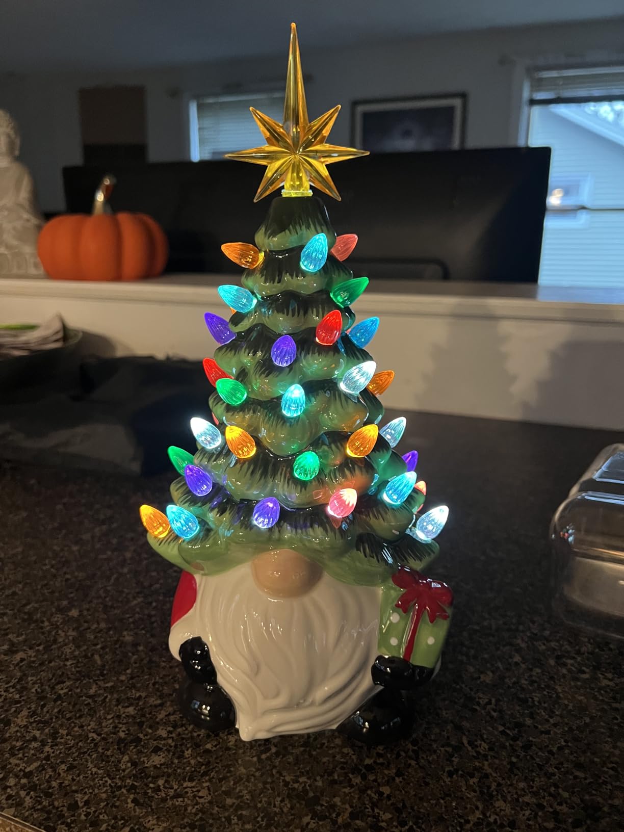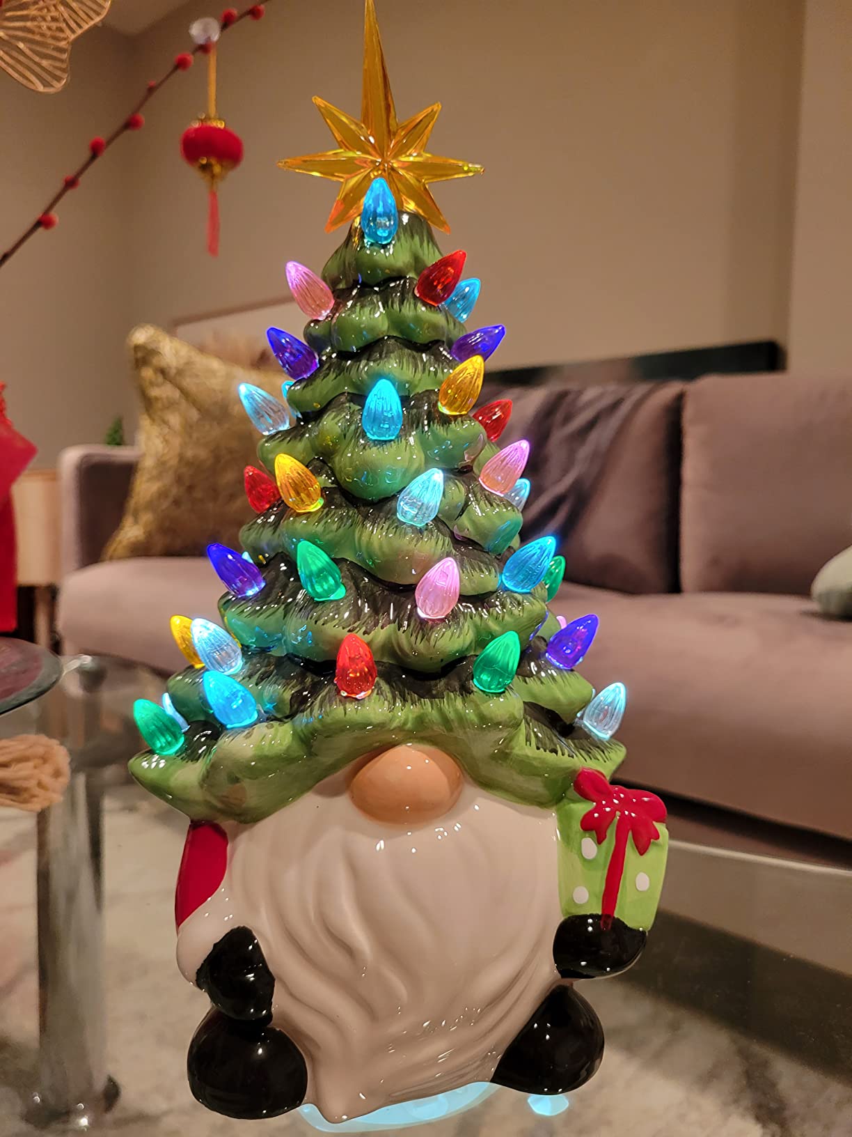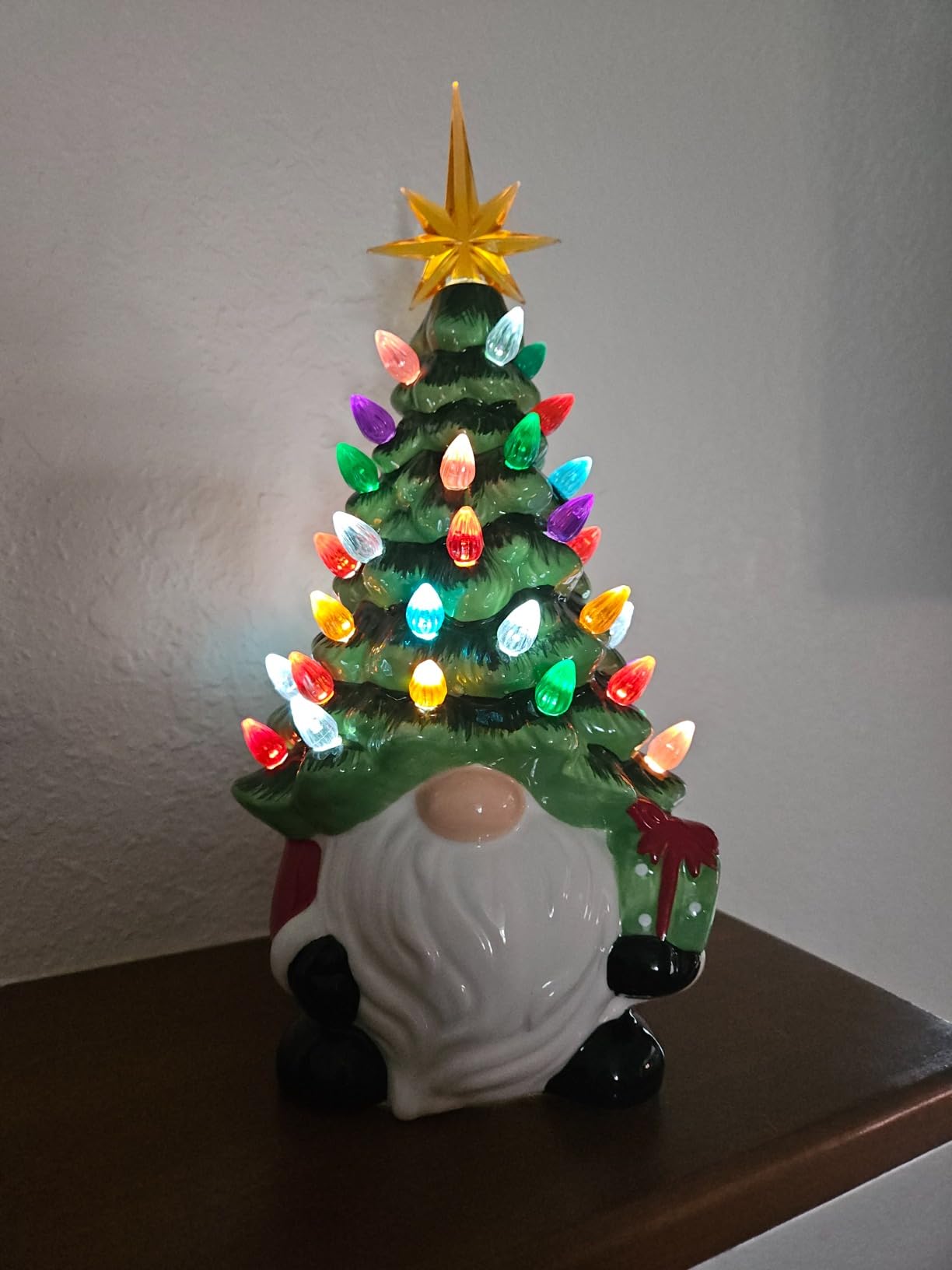 Crafted from hand-painted ceramic, this gnome tree features colorful crystal bulbs and a golden star topper you place yourself, making setup fun and simple. Once assembled, it lights up with a warm glow that brings instant Christmas cheer to mantels, shelves, or tables.