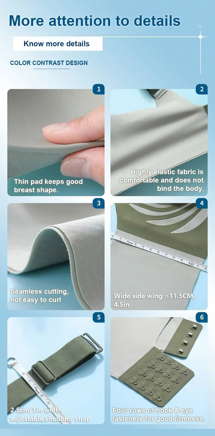 Defy Sagging & Side SpillageEngineered for natural lift and contour, the Super Gather Bra smooths armpit fat, supports sagging, and shapes your figure—without wires or discomfort. The 3D fixed pads and wide straps provide all-day stability and comfort.