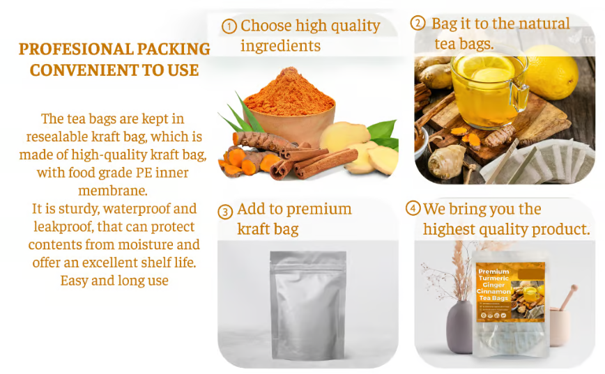 Introducing our Premium Turmeric Ginger Cinnamon Tea—hand-crafted with 100% natural ingredients to support daily wellness. This earthy, aromatic blend helps soothe the body and mind, with no sugar, no caffeine, and no gluten. Packed in eco-friendly tea bags and sealed for freshness, it’s the perfect ritual for morning clarity or evening calm.