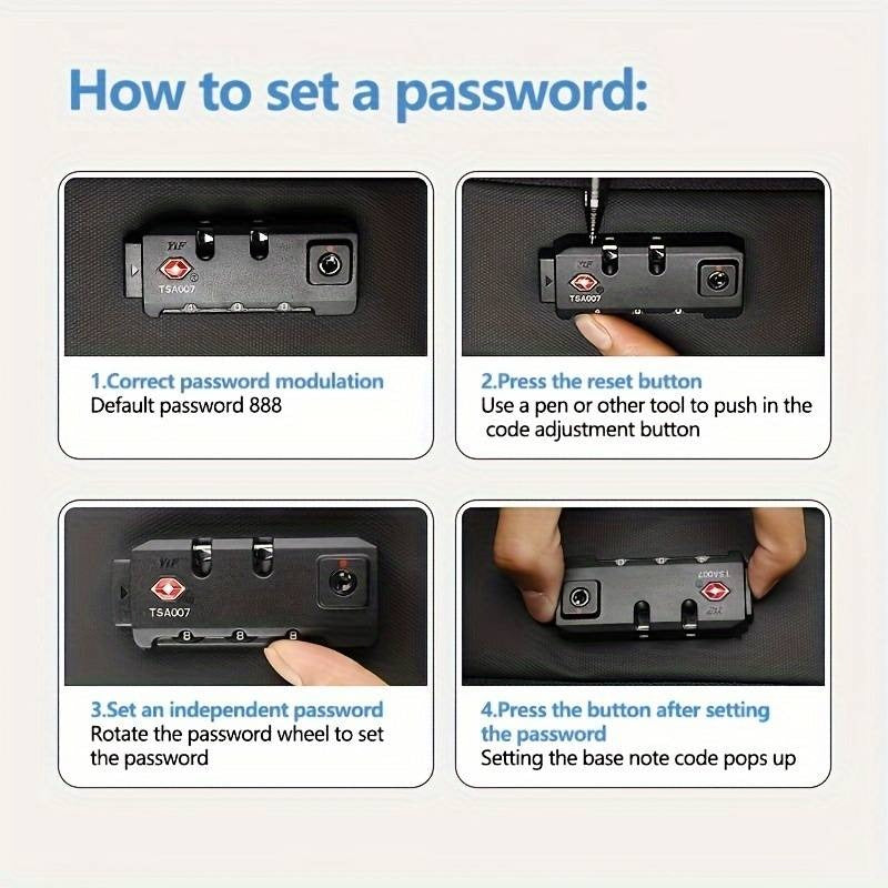 - Lock the zippers into the TSA-approved password lock for security.